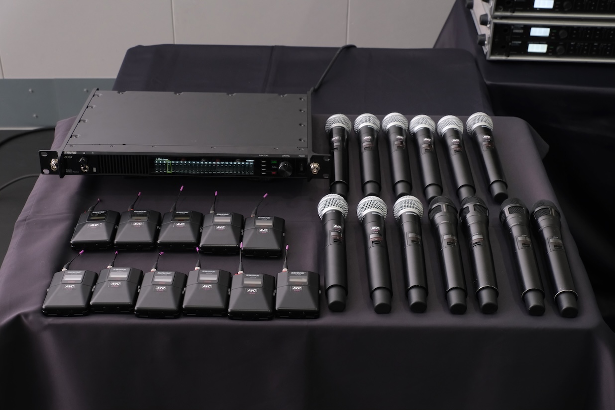 ▲ANX4と24ch分のULX-D送信機。ボディバック型がULXD1、ハンドヘルド型ULXD2はSM58(ヘッド)とNexadyne8/S(ヘッド)
