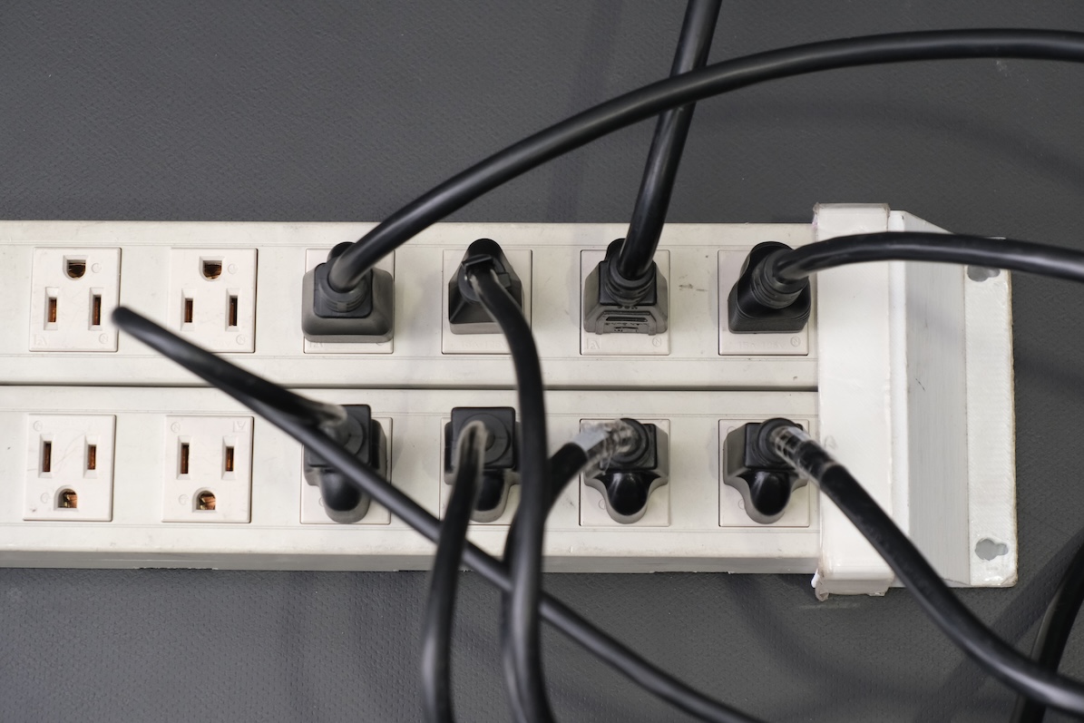 ▲上写真右側は従来の24chのULX-Dシステム稼働に必要なコンセント。電源タップの多くの口を占拠することになる